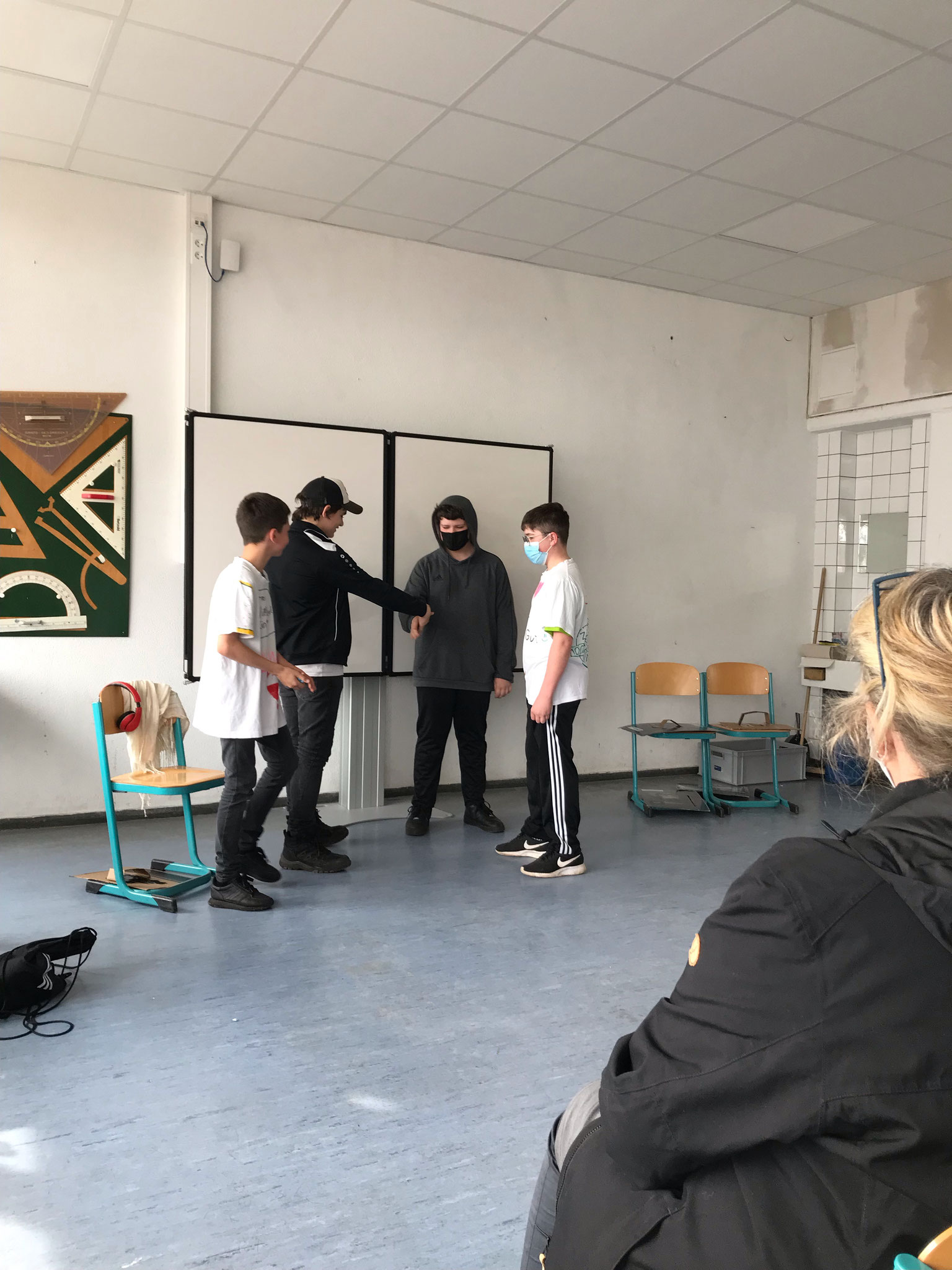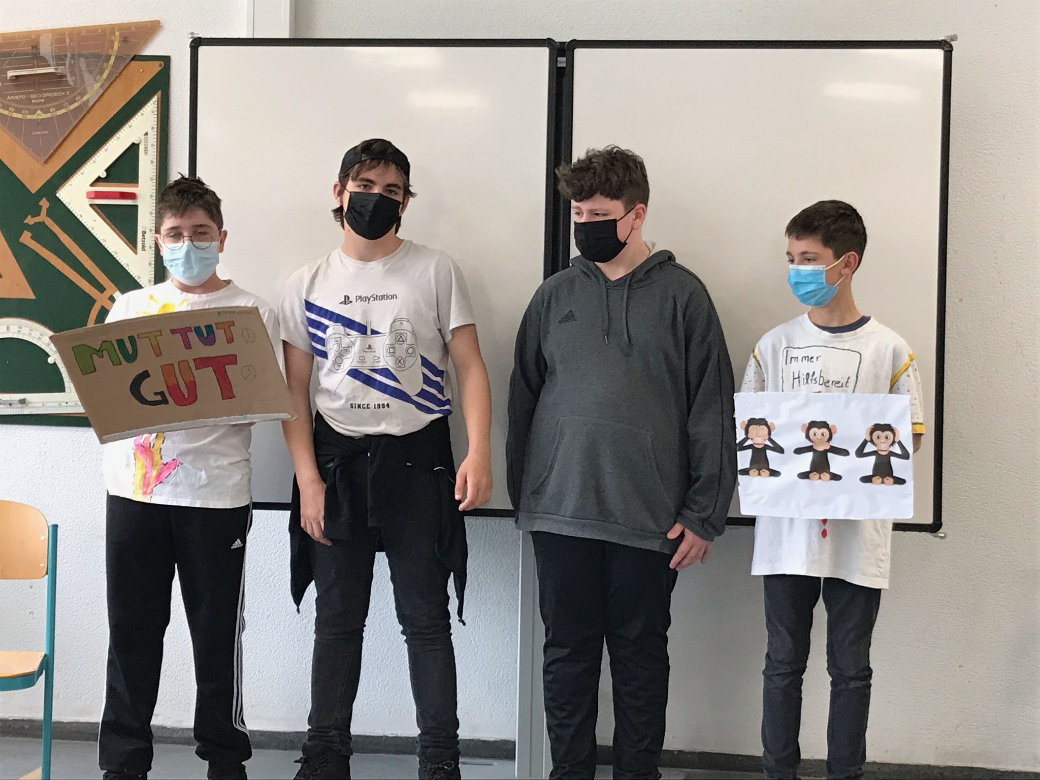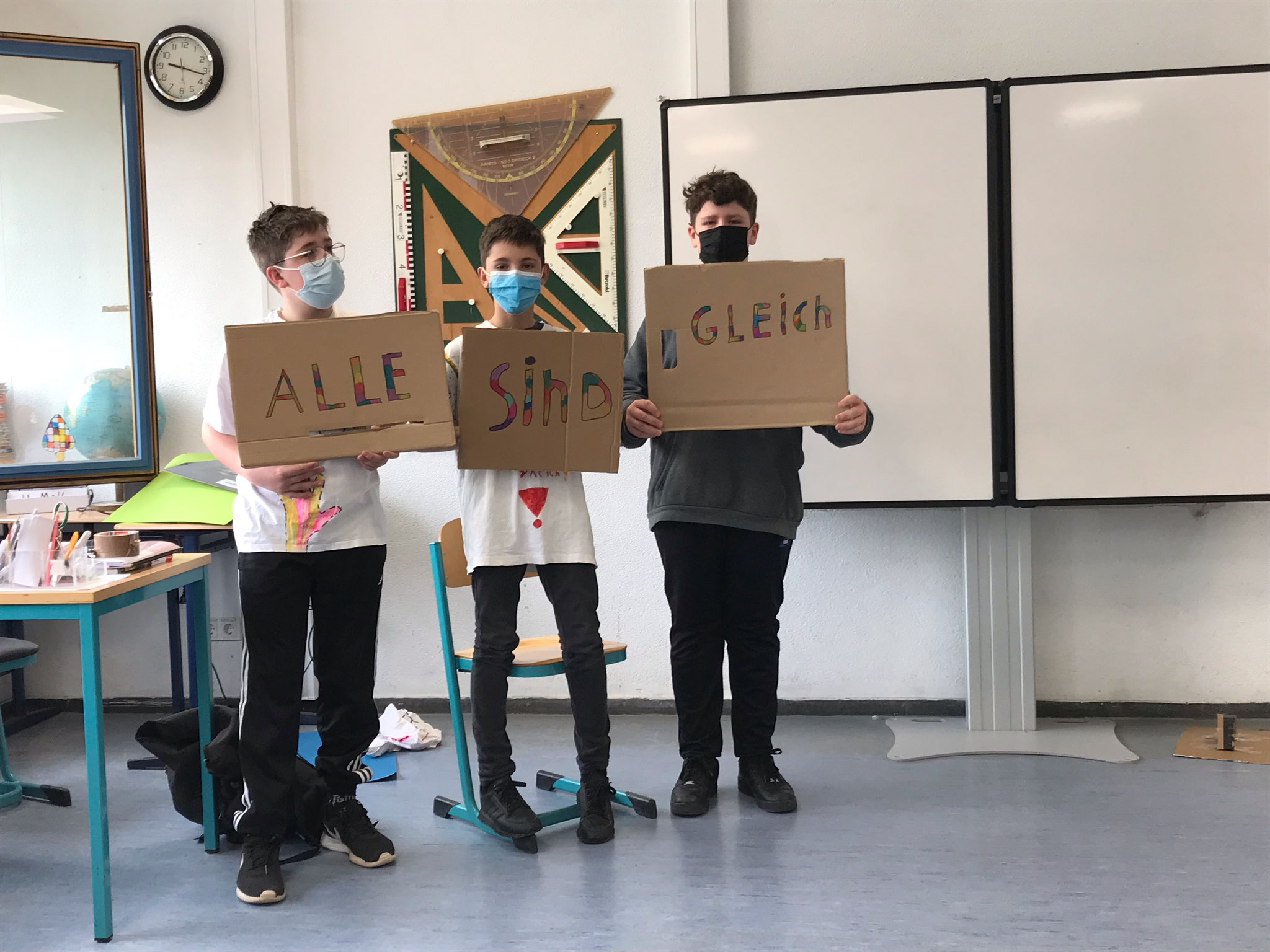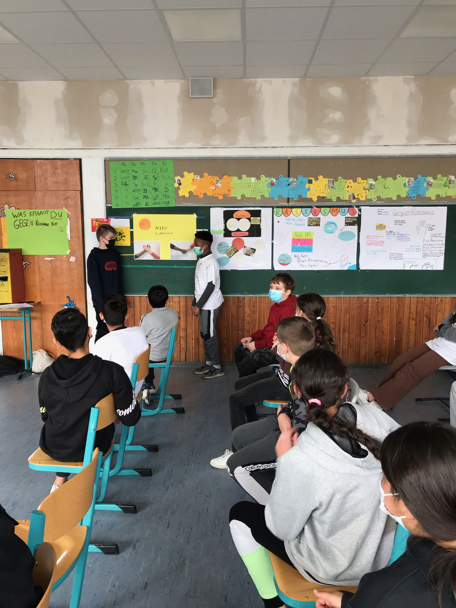 Die Klasse 6a setzte sich intensiv mit den Fragen „Was ist Rassismus und was kann ich dagegen tun?“ auseinander. Eigenständig sammelten die Schülerinnen und Schüler Informationen zum Thema und präsentierten diese in vielfältiger Weise den Mitschülerinnen und Mitschülern der fünften und sechsten Klassen. Es entstanden informative Plakate und selbstgestaltete T-Shirts. In einer „Kiste gegen Rassismus“ wurden Erfahrungen und Tipps gegen Diskriminierung gesammelt, die eine weitere Auseinandersetzung mit dem Thema ermöglichen. Eine Schülerin bereitete Sticker gegen Rassismus vor und verteilte diese nach der Aufführung den Gastklassen. Kleine Theaterszenen rundeten die Präsentation ab, die von Monika Staszkiewicz, Respekt Coach vom Jugendmigrationsdienst Trier, konzipiert und begleitet wurde.